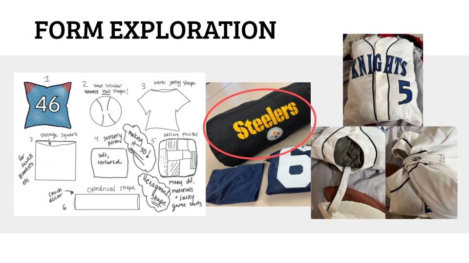 We started by exploring form and the different shapes that pillows can take and the differing functions they can have. We even experimented with a pillow that can change form. We decided that the pill/cylindrical shaped pillow had the most opportunity.