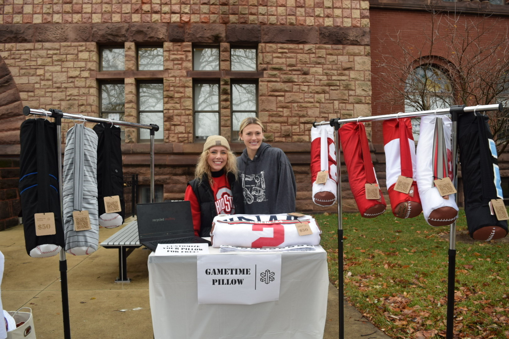 Finally, we had a table stand that called out our customization workshop inside Hayes Hall. Customers could walk in with their pillow and get their names or any phrase they wanted Cricut cut (with vinyl) and ironed on to the strap of the pillow!