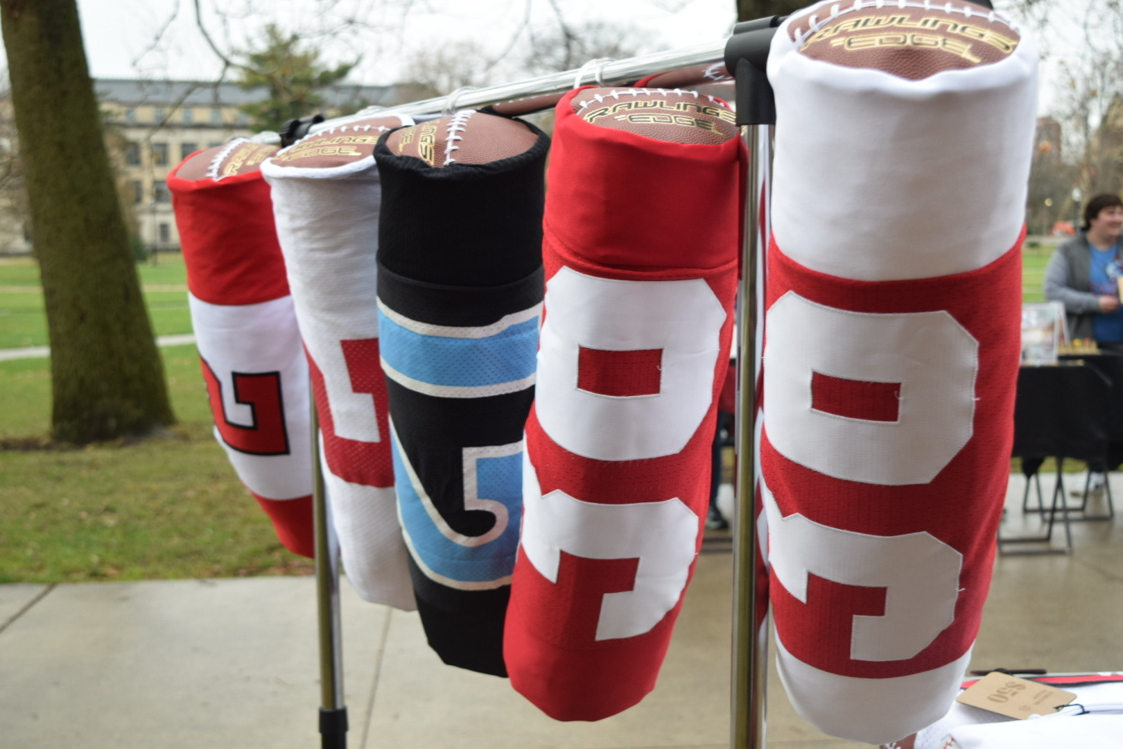 Here is our persuasive visual which points out some key features of the pillow…it features a long zipper to easily remove the stuffing case and wash for extended freshness, it highlights its unique cylindrical shape and length, and it points out the material it is made of, real jersey and football skin.